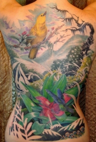 背部彩色的花朵和蜂鸟纹身图案