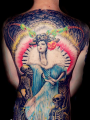 满背彩绘,花旦与骷髅纹身图案
