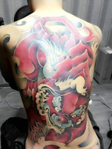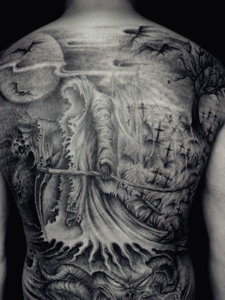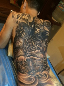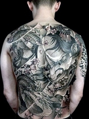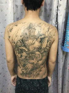 男子喜爱的头骨和人物头像和动物的满背纹身图案