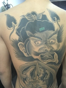 满背黑灰色戴虎头帽的部落女性纹身图片