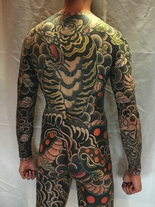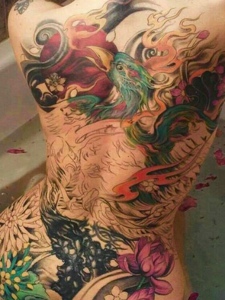 超级完美炫酷的满背彩色鲤鱼纹身图案
