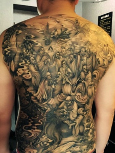 男子满背传统风格花和帆船图案纹身+++满背,男人,男性,男生,帆船,传统