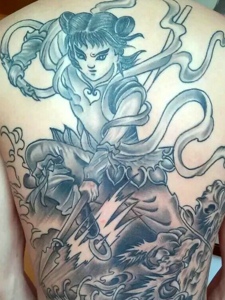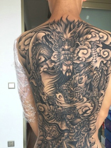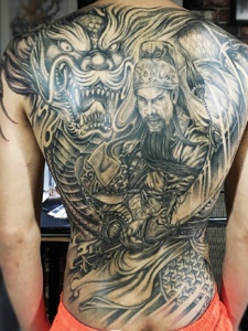 邪龙与关公结合的满背纹身图案