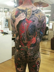 色彩丰富的满背日式猫纹身图案