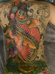 满背色彩迷人的大鲤鱼纹身图案