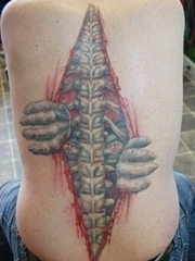 背上的皮就像是拉链拉开露出骨头一样的3D纹身图案