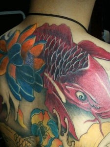 满背两条颜色不一样的大鲤鱼纹身图案