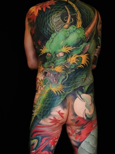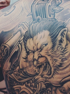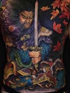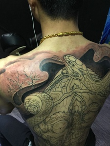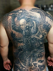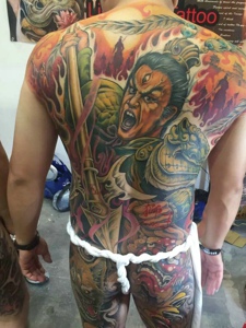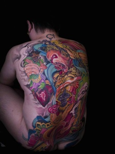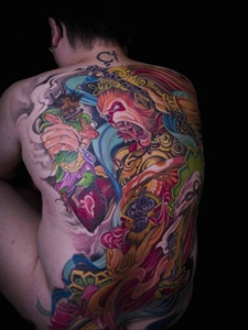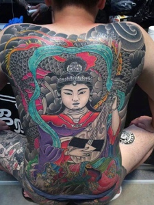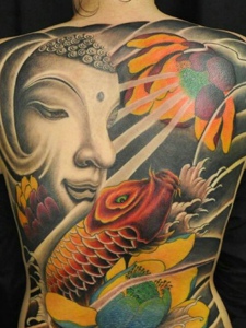 如来佛与鲤鱼结合的满背彩色纹身图案