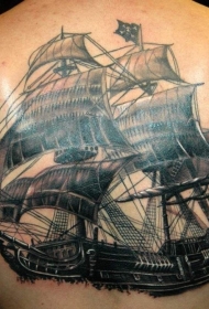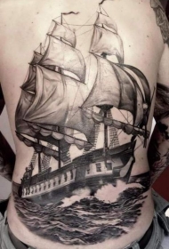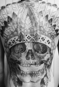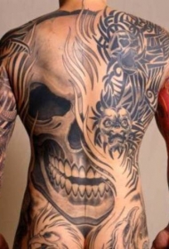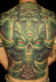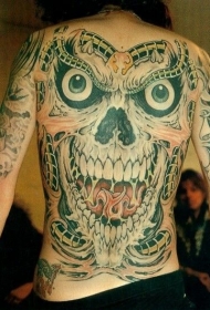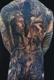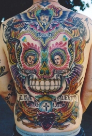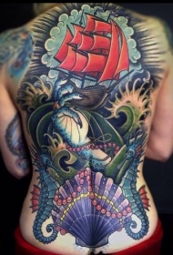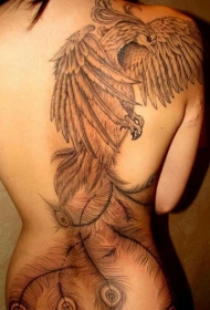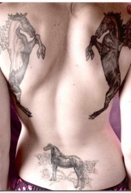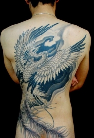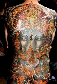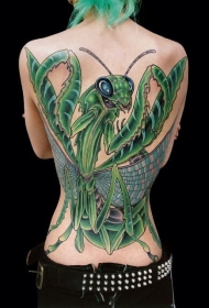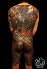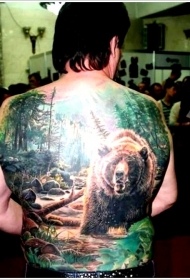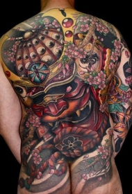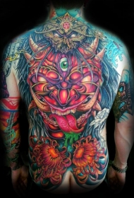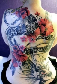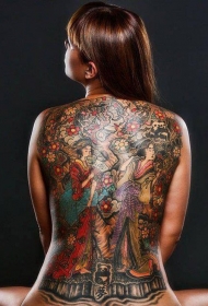 女生满背彩色日式艺妓花朵熊猫纹身图案