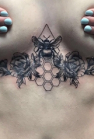 蜜蜂纹身图案 女生胸下蜜蜂和花朵纹身图片