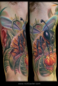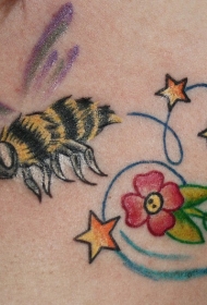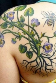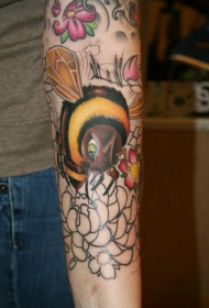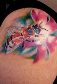 肩部缤纷多彩的蜜蜂与花朵纹身图案