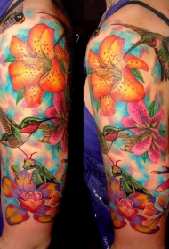 鲜艳的百合花蜂鸟蜜蜂和蚱蜢手臂纹身图案
