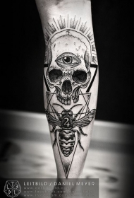 手臂有趣的神秘黑白骷髅与眼睛和蜜蜂纹身图案