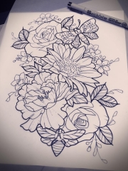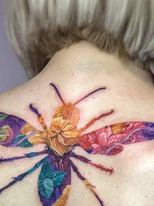 欧美玫瑰樱花蜻蜓蜜蜂纹身图案手稿