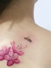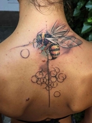 女子背部脊椎骨上的线条和蜜蜂纹身图片