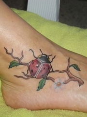 逼真的瓢虫和叶子彩色脚背纹身图案