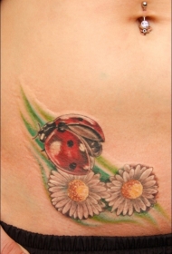 腹部漂亮的彩色瓢虫和花朵纹身图案