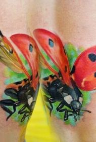 背部瓢虫和花朵藤蔓彩色纹身图案