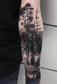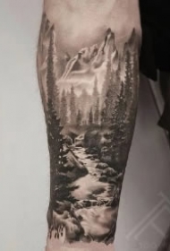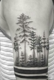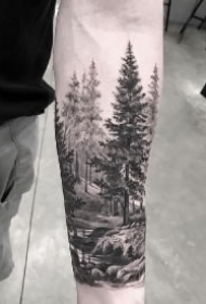 男生手臂上黑色素描点刺技巧森林风景纹身图片