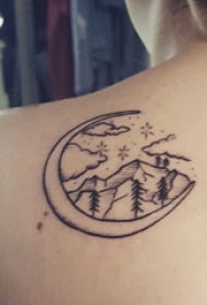 极简线条纹身 女生后背上月亮和山脉纹身图片