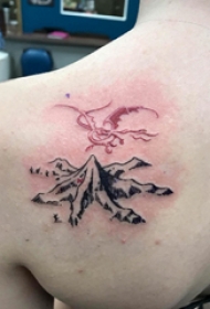 小山峰纹身 女生后背上飞龙和山脉纹身图片