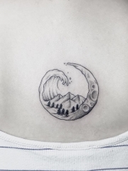 背部海浪月亮山脉点刺纹身图案