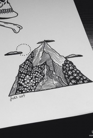 欧美山脉花朵线条纹身图案手稿