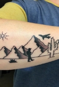 男生手臂上彩绘渐变简单线条山脉和植物纹身图片