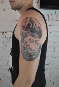 男生手臂上黑灰点刺抽象线条山和人物纹身图片