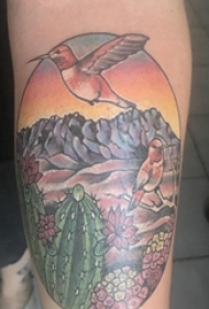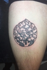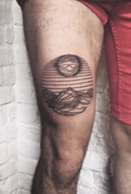 男生大腿上黑灰点刺抽象线条植物和山脉风景纹身图片