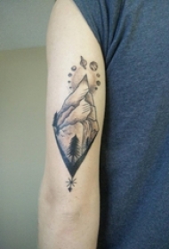 男生肩部彩绘渐变星空元素简单线条山脉纹身图片