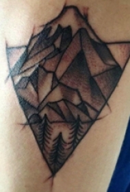 男生手臂上黑灰点刺抽象线条山峰和植物大树纹身图片