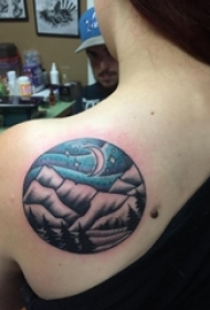 女生后肩上彩绘简单线条山脉和森林风景纹身图片