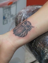 手腕上呆呆可爱的猫头鹰纹身