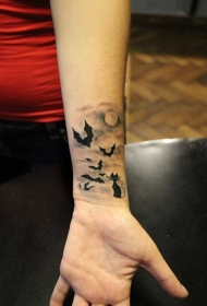 手腕黑色的猫和蝙蝠在夜间纹身图案