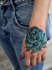 女生手腕彩绘蓝玫瑰纹身图案