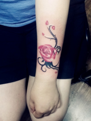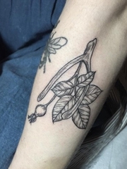 手前臂上精致的黑色点刺野玫瑰果纹身图案
