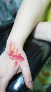 女生手部潮流经典的彩色小金鱼纹身图案