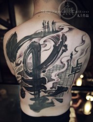 泼墨书法满背纹身 新传统风格纹身 无上出品