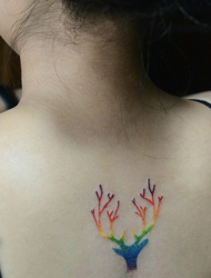 女生白皙的后背有着创意彩色树枝纹身