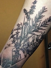 黑色的植物树叶和花纹身图案来自于纹身师泰德
