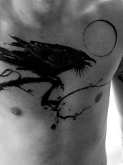 胸口泼墨树枝乌鸦意境纹身图案