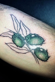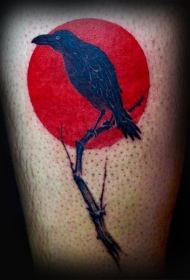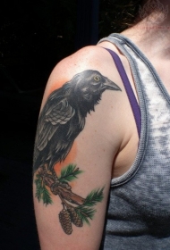 大臂old school彩色乌鸦坐在杉木枝纹身图案