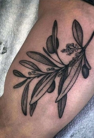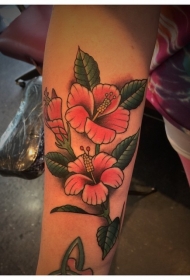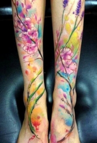 腿部鲜艳的花朵和树枝水彩纹身图案