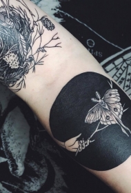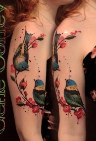 大臂彩色的小鸟和盛开的花朵纹身图案