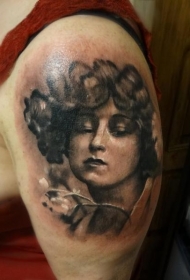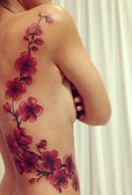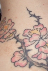 女士肩膀上的树枝和粉红色花朵纹身图案