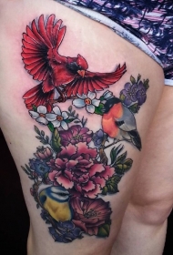 大腿奇妙的彩色鸟和盛开的花朵纹身图案