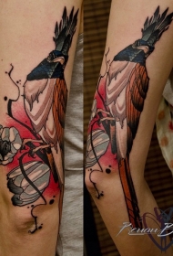 插画风格的彩色幻想鸟与花朵树枝手臂纹身图案