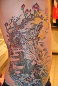 背部亚洲风格的鹰与树枝彩色纹身图案
