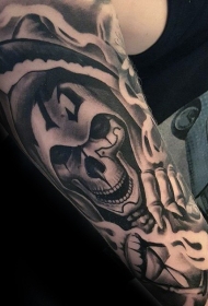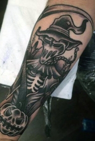 手臂黑色雕刻风格死亡骷髅与南瓜纹身图案